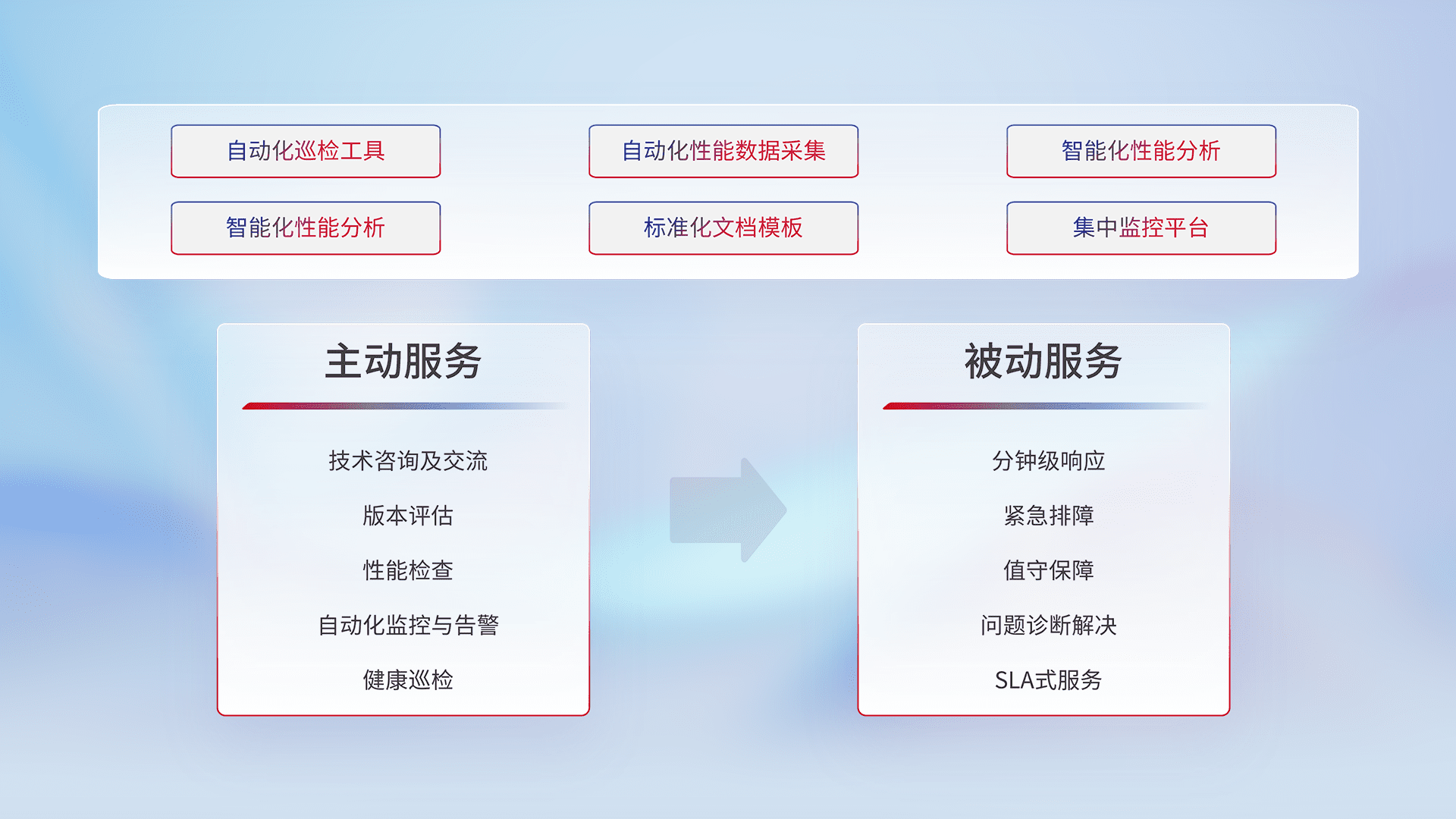 智能化工具和标准化文档,,,保障服务质量,,提供主动服务(包含技术咨询、、、版本评估、、、、性能检查、、、自动化监控与告警、、健康巡检)和被动服务包含(分钟级响应、、紧急排障、、值守保障、、、问题诊断解决、、SLA服务)。。。。